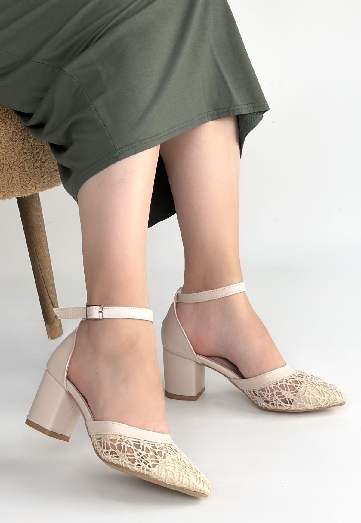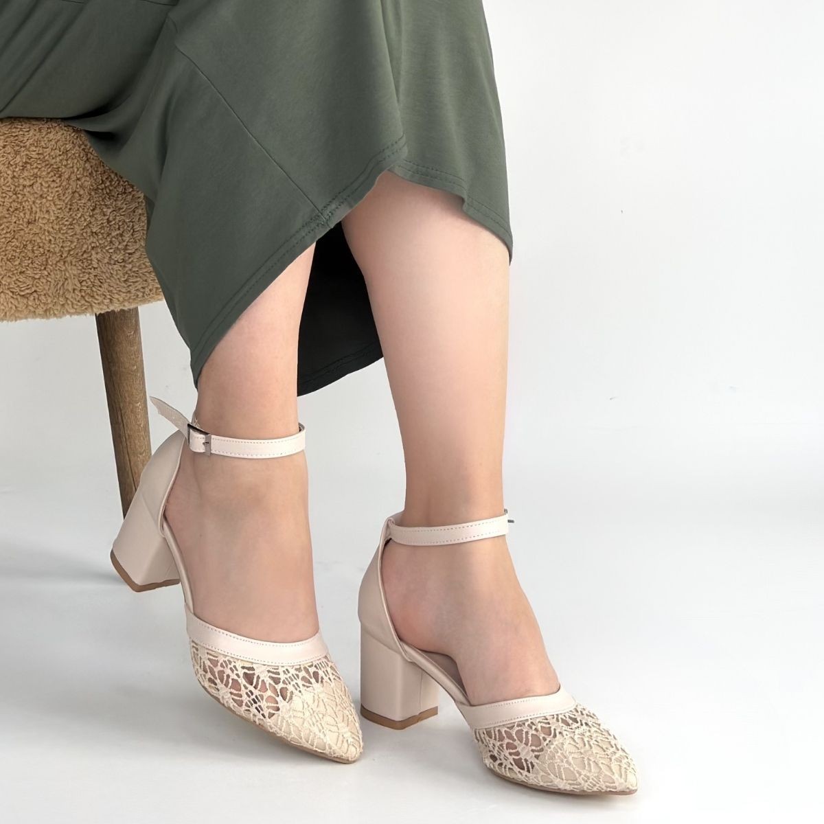 • Dmop Bej Cilt Tül Detaylı Topuklu Ayakkabı