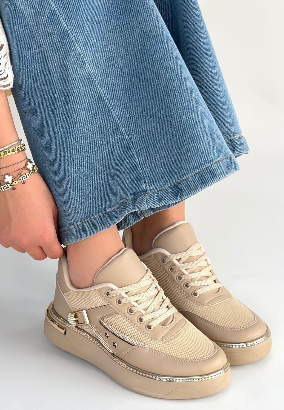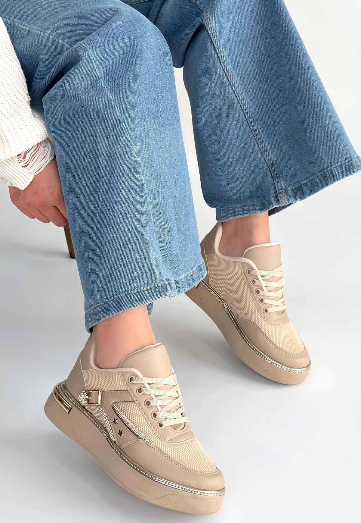 • Junda Bej Cilt Bağcıklı Spor Ayakkabı