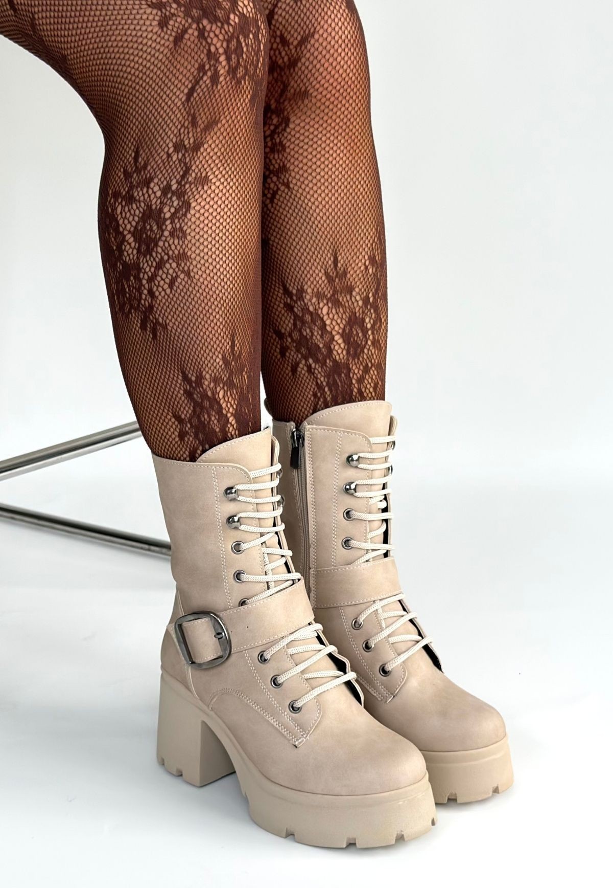 • Linma Bej Nubuk Bağcıklı Topuklu Bot