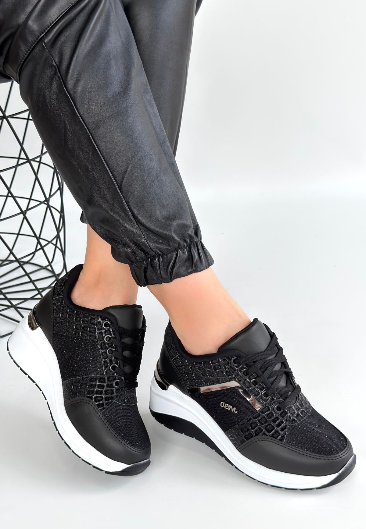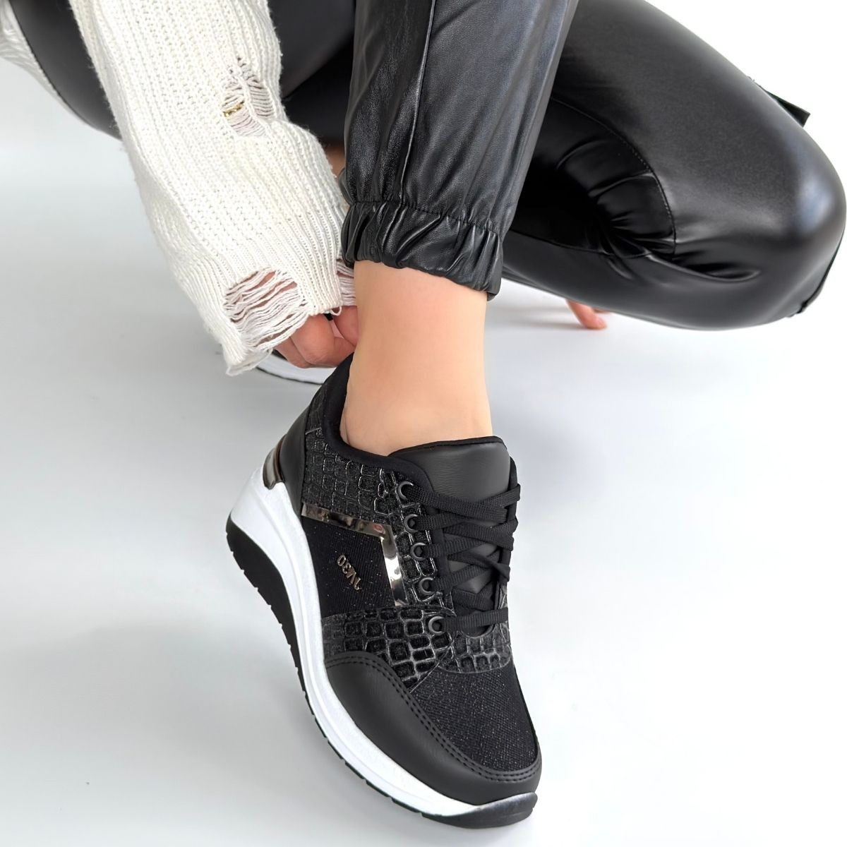 • Geja Siyah Cilt Bağcıklı Beyaz Tabanlı Spor Ayakkabı