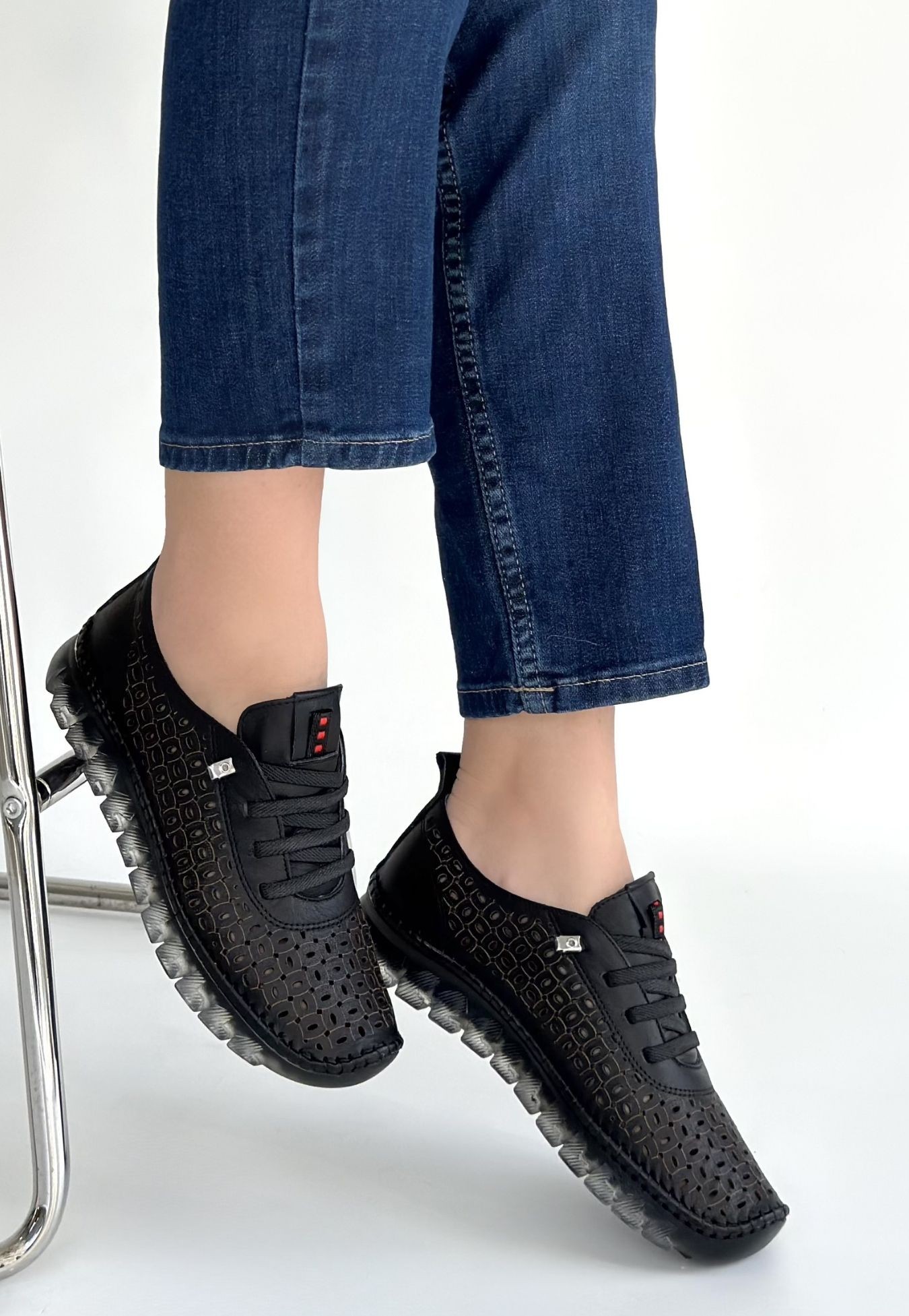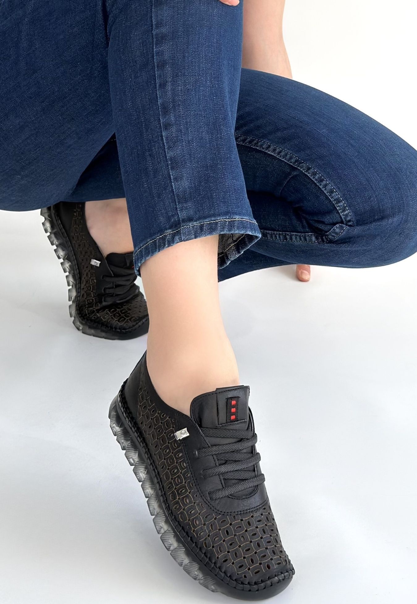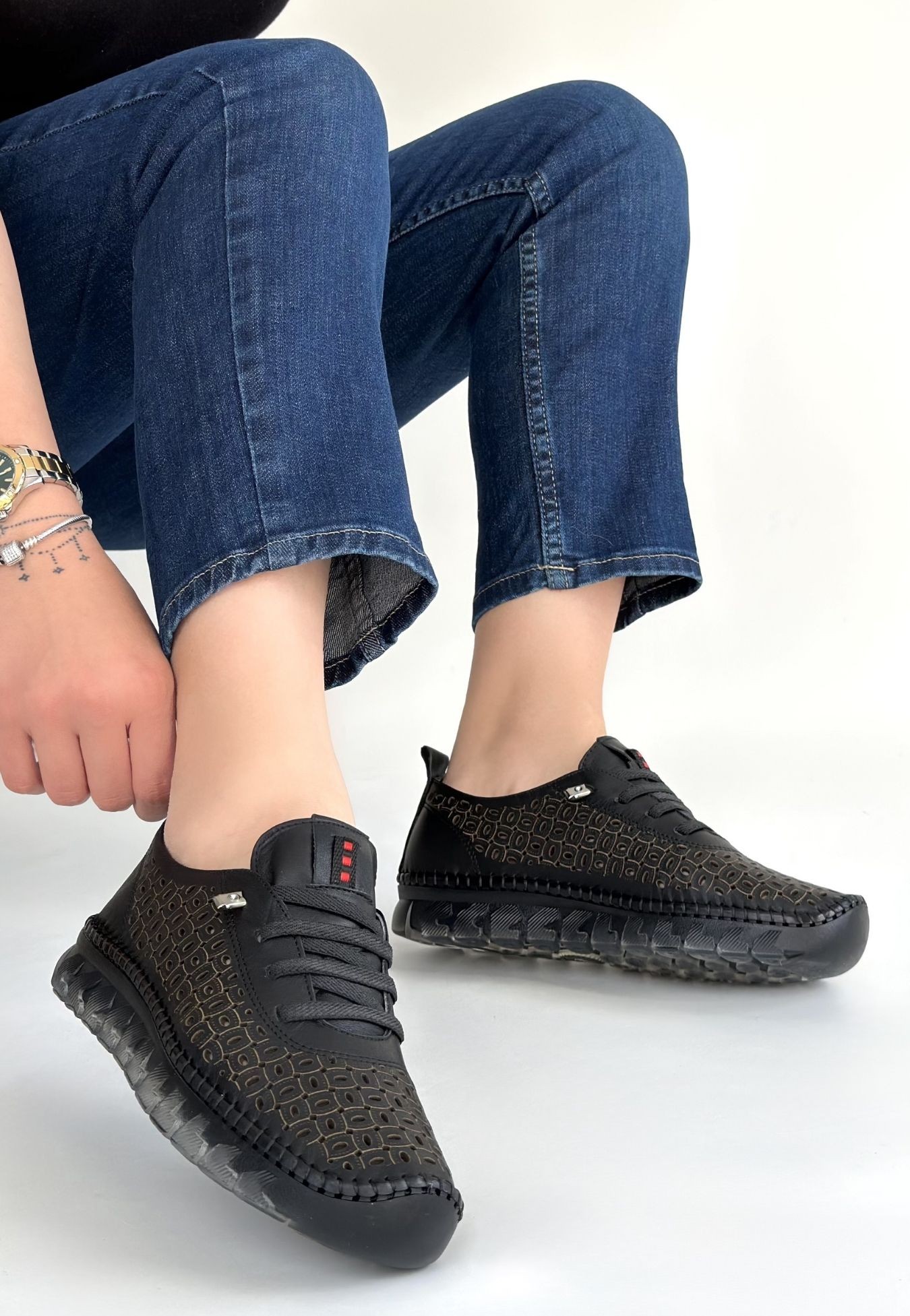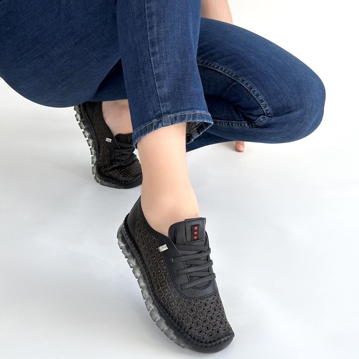 • Otja Siyah Deri Lazerli Bağcıklı Spor Ayakkabı