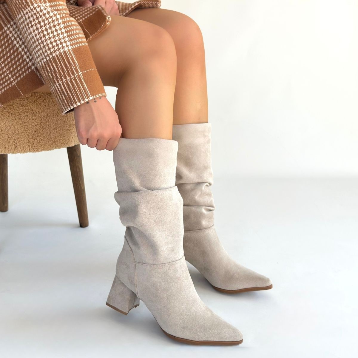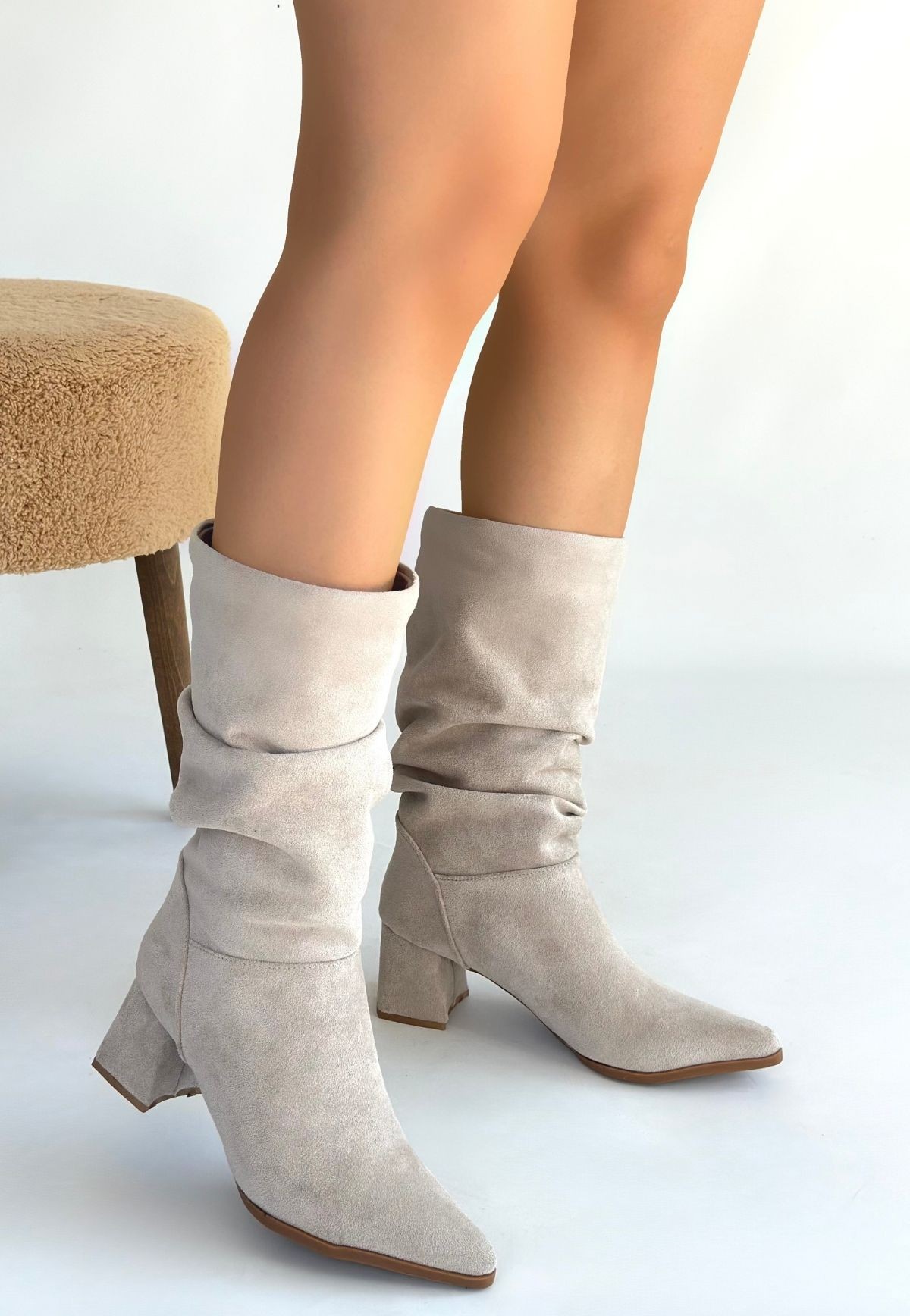 Titen Bej Süet Körüklü Topuklu Çizme