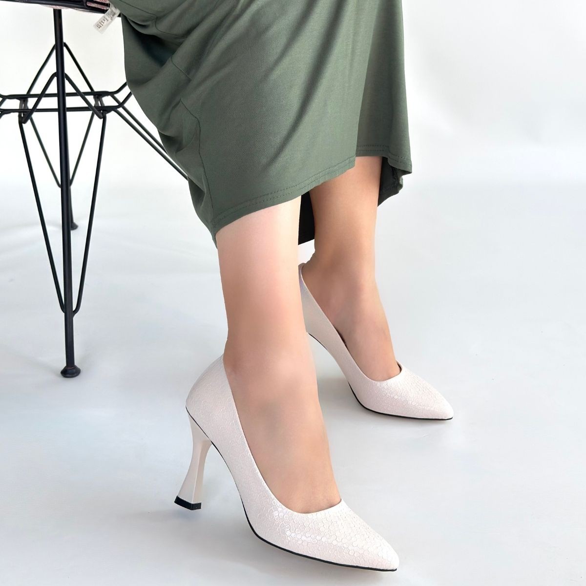 Topuklu Merio Bej Baskılı Rugan Topuklu Ayakkabı