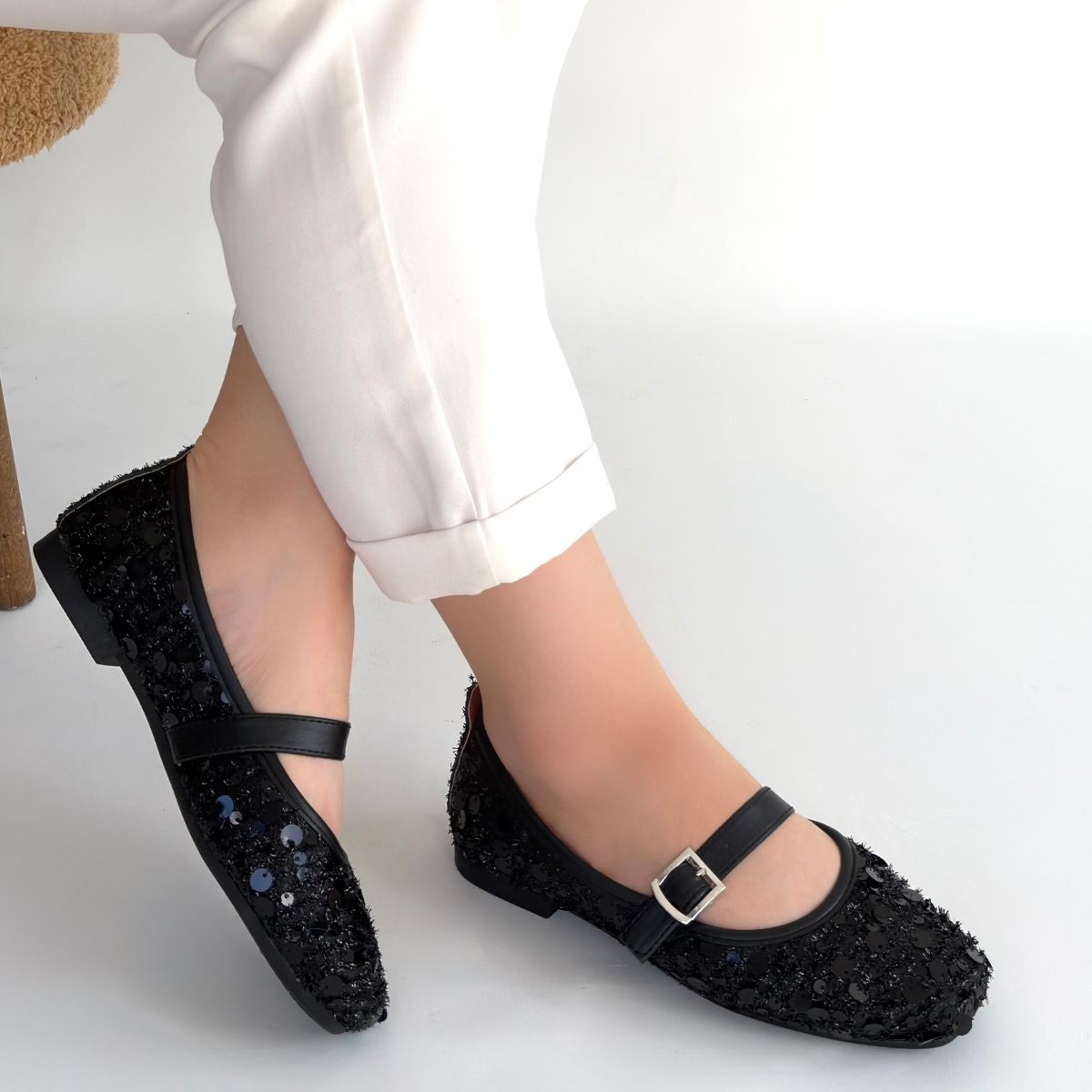 • Zaty Siyah Süet Siyah Pullu Babet Ayakkabı